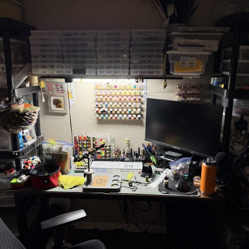 Last month was the NW Expo in Albany, Oregon. It’s one of the largest fly tying shows in the United States and I was fortunate enough to be able to tie at the show for both days. My main focus was on flies used mostly in competitions here in the states and internationally. The flies aren’t particularly different from what any other angler might use when they go fishing, but there is a more deliberate focus on the function of flies than the actual design when it comes to competition flies. I got more into the weeds with all of this when I was talking to people at the expo. I focused on two flies in particular that I fish often when I’m either competing or when I’m practicing. One was my Slim Damsel (Big Jim Damsel), that I use on stillwaters, and the other was my Kid Cuisine Caddis, that is a river pattern. They’re a couple of my confidence flies that I always make sure I have stock of when I go out fishing. I normally start the day out with one of them on my setup depending where I fish.